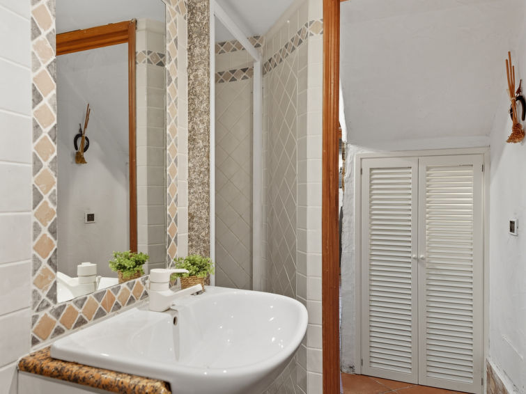 "Ortensia", huis 4-kamers 60 m2. Rustiek en gezellig ingericht: woon-/eetkamer met Sat-TV (Flatscreen TV), boiler. Uitgang naar het terras. 1 kamer met 2 bedden. Open keuken (4-pits kookplaat, oven, afwasmachine, magnetron). Douche/bidet/WC. Air-conditioning, heteluchtverwarming. Bovenverdieping: 1 2-pers. kamer. 1 kamer met 1 x 2 stapelbedden. Douche/bidet/WC. Groot terras overdekt. Terrasmeubelen, zitgelegenheid. Zeer mooi, op zee en het zwembad. Ter beschikking: wasmachine, strijkijzer, klamboe, haardroger. Internet (WiFi, gratis). Parkeerplaats nr. 22 (omheind). Maximaal 1 huisdier/hond toegestaan. IT090047C2000T0200
